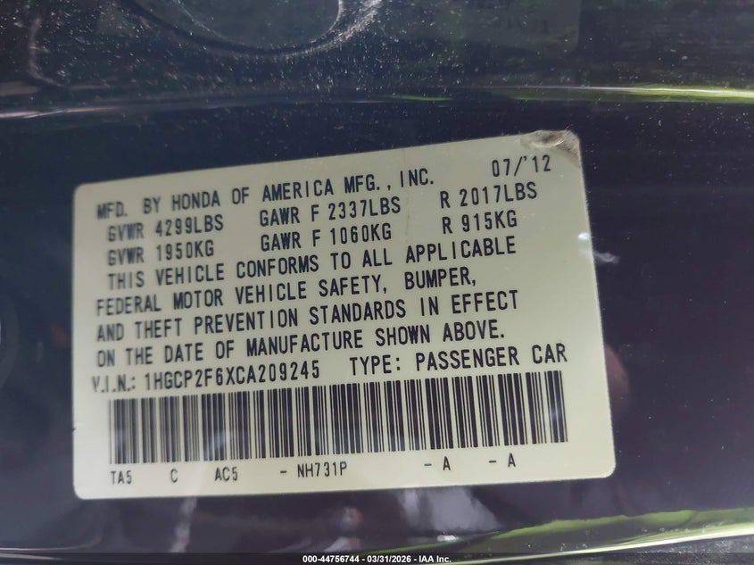 • 1HGCP2F6XCA209245
