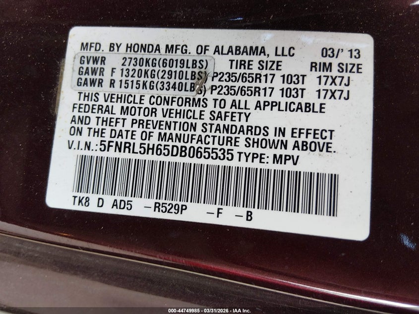 • 5FNRL5H65DB065535