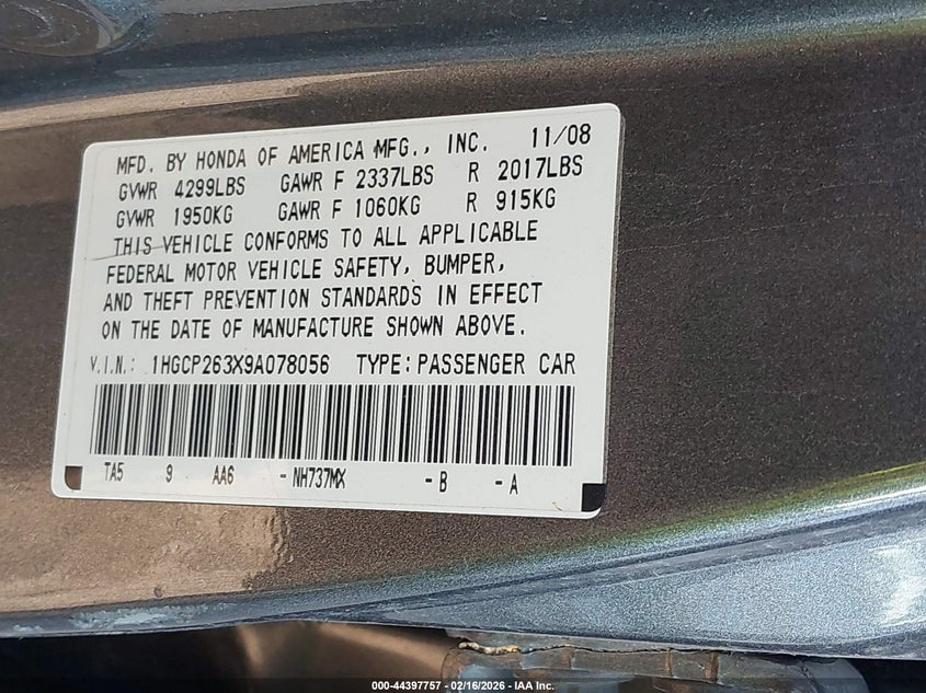 • 1HGCP263X9A078056