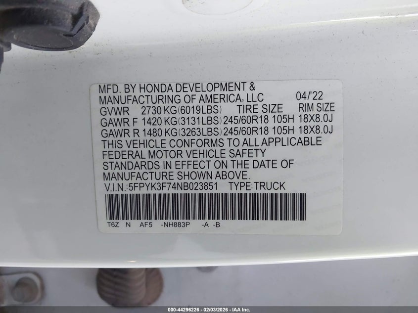 • 5FPYK3F74NB023851