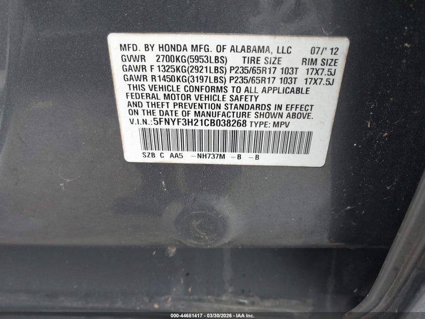 • 5FNYF3H21CB038268