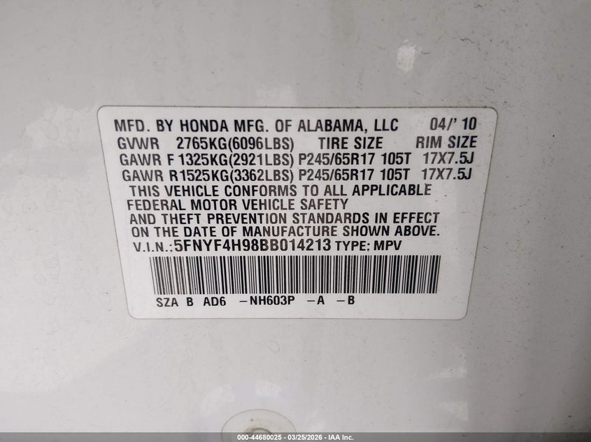 • 5FNYF4H98BB014213