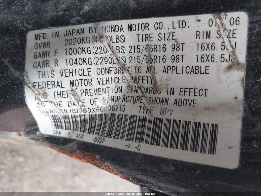 • JHLRD789X6C036215