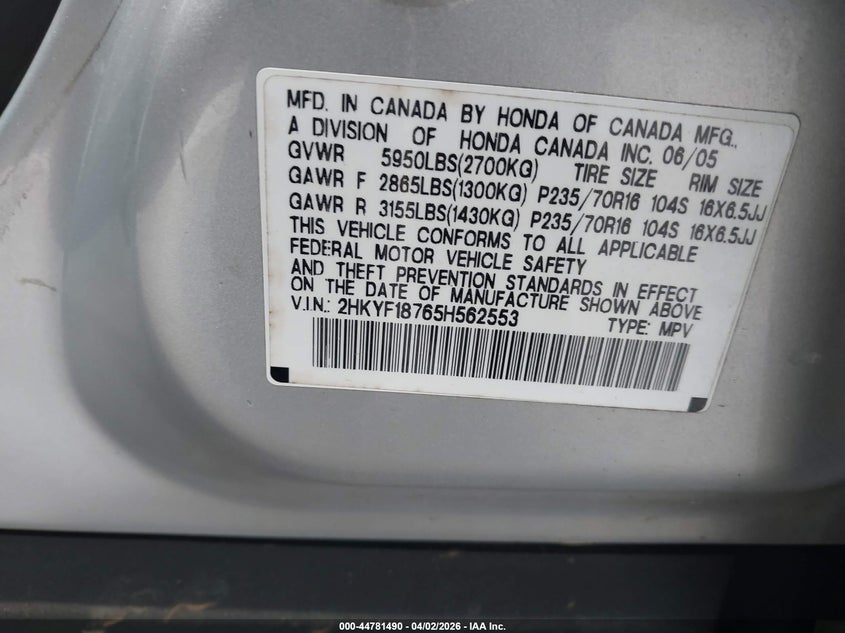• 2HKYF18765H562553