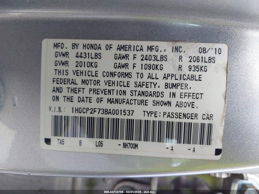• 1HGCP2F73BA001537