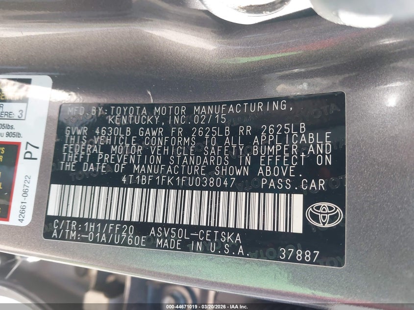 • 4T1BF1FK1FU038047