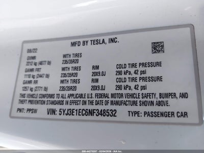 2022 TESLA MODEL 3 PERFORMANCE DUAL MOTOR ALL-WHEEL DRIVE for Sale in Electric Vehicle Auctions, None