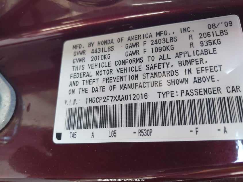 • 1HGCP2F7XAA012016