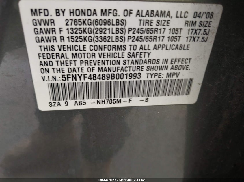 • 5FNYF48489B001993