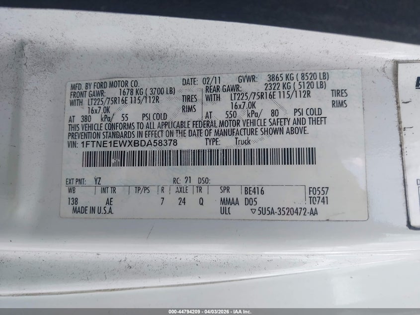 • 1FTNE1EWXBDA58378