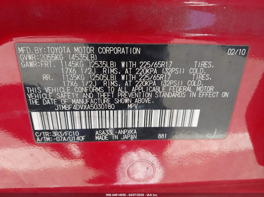 • JTMBF4DVXA5030180