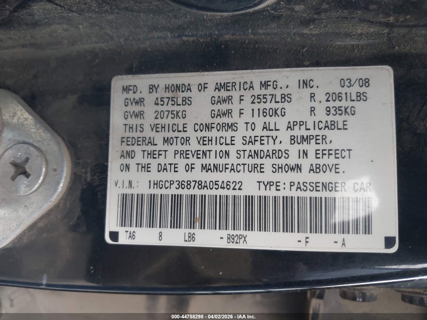 • 1HGCP36878A054622