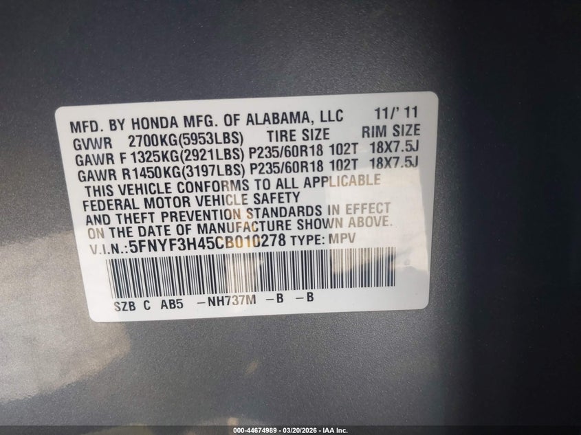 • 5FNYF3H45CB010278