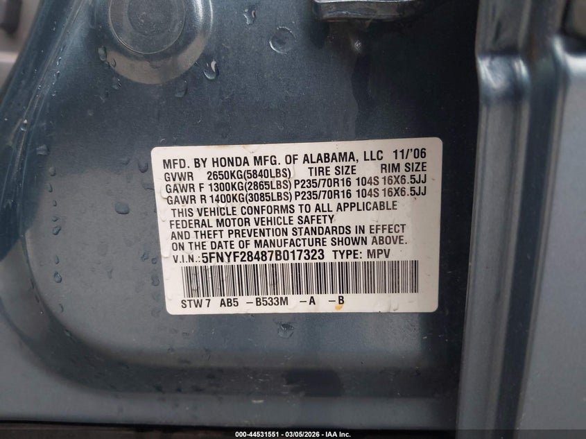 • 5FNYF28487B017323