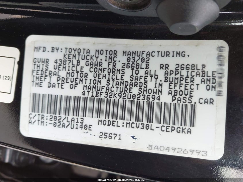 • 4T1BF32K92U023694