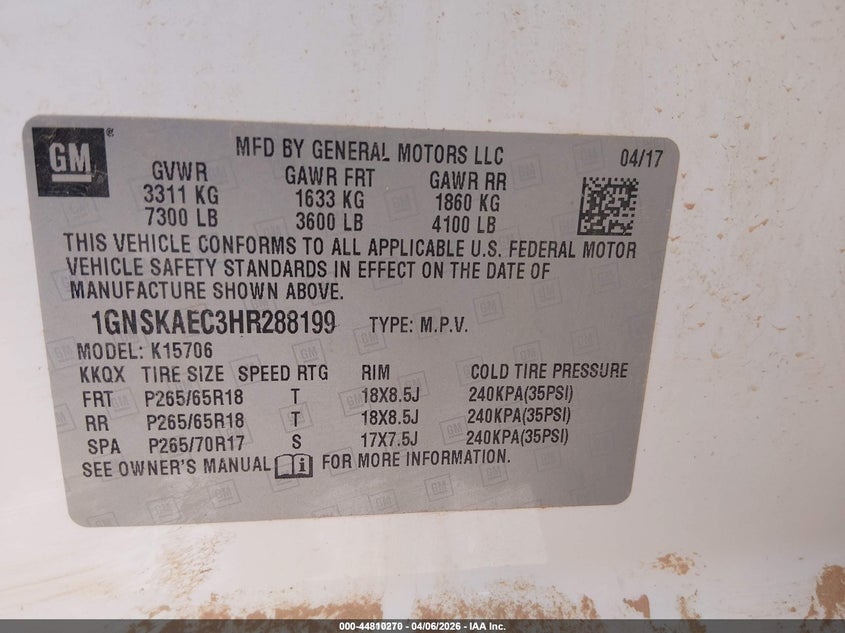 • 1GNSKAEC3HR288199