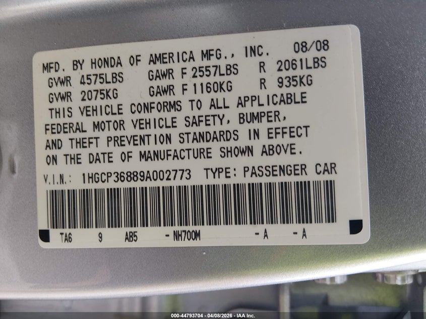 • 1HGCP36889A002773