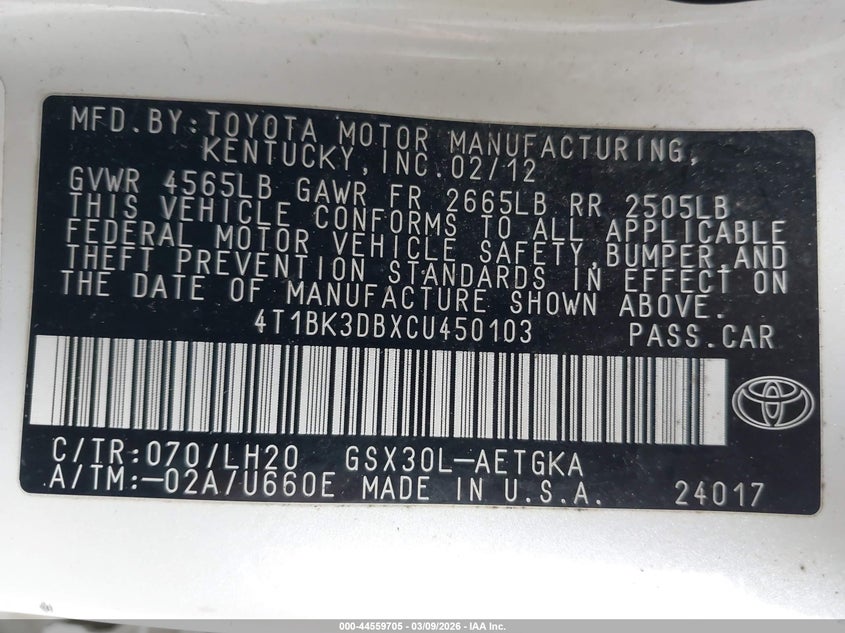 • 4T1BK3DBXCU450103