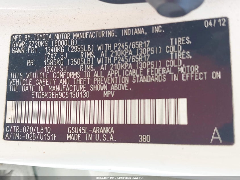 • 5TDBK3EH9CS150130