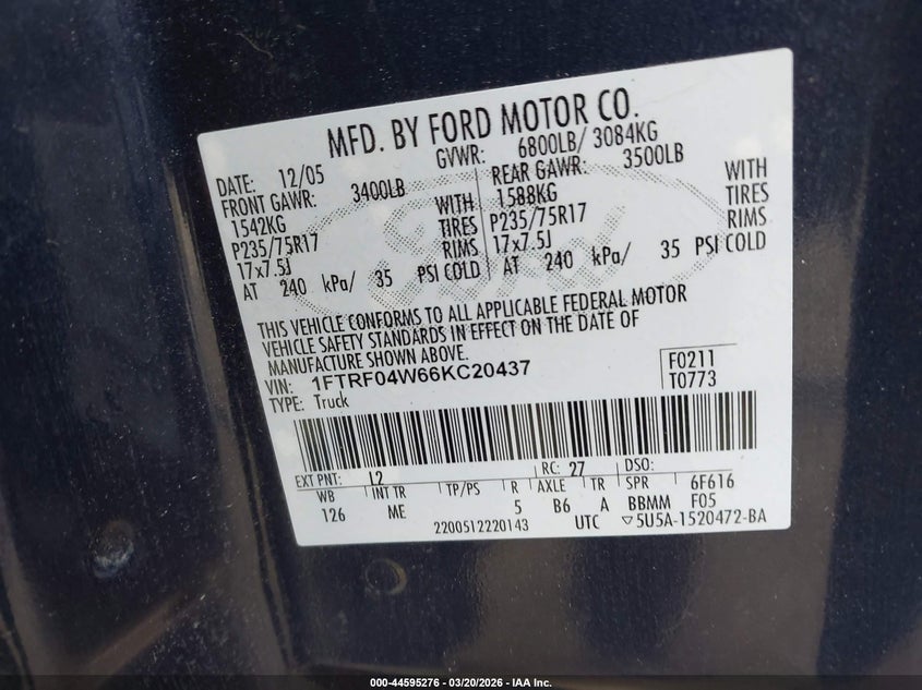 • 1FTRF04W66KC20437