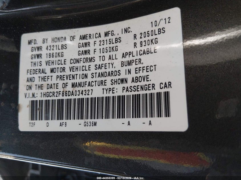 • 1HGCR2F86DA034327