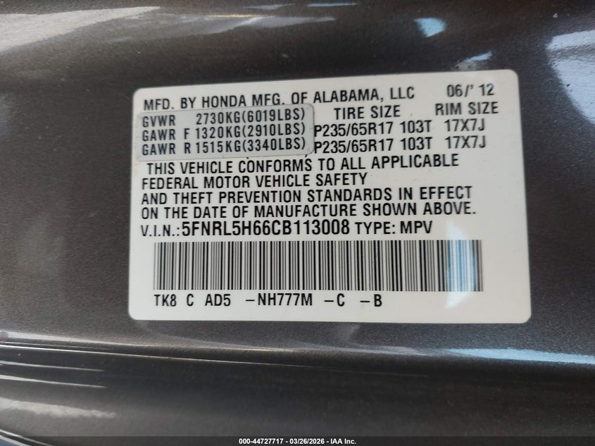 • 5FNRL5H66CB113008