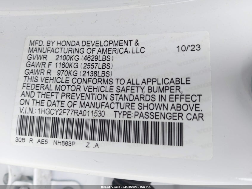 • 1HGCY2F77RA011530