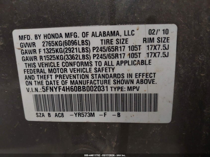 • 5FNYF4H60BB002031
