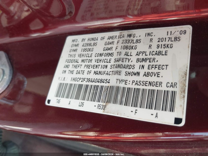 • 1HGCP2F39AA048454