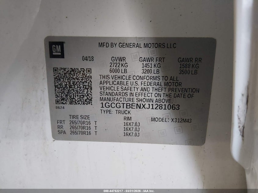 2018 CHEVROLET COLORADO WT for Sale in Gov Auctions Zone 1, None