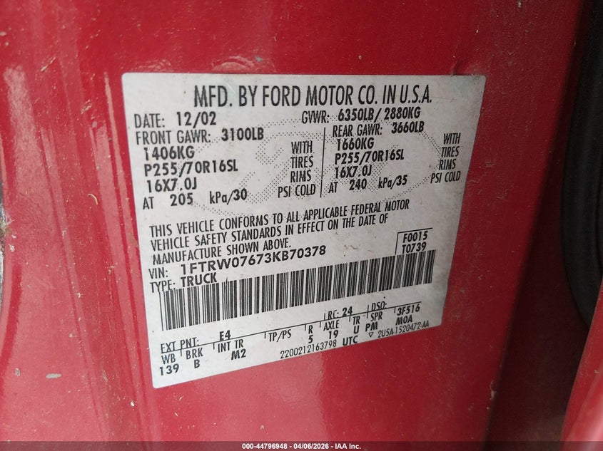 • 1FTRW07673KB70378