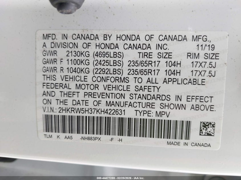• 2HKRW5H37KH422631