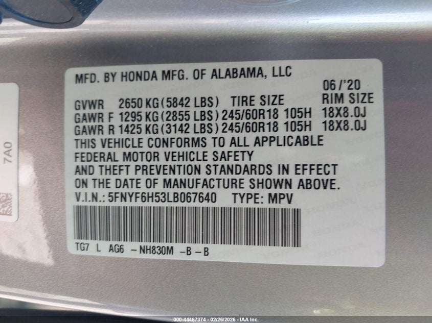 • 5FNYF6H53LB067640