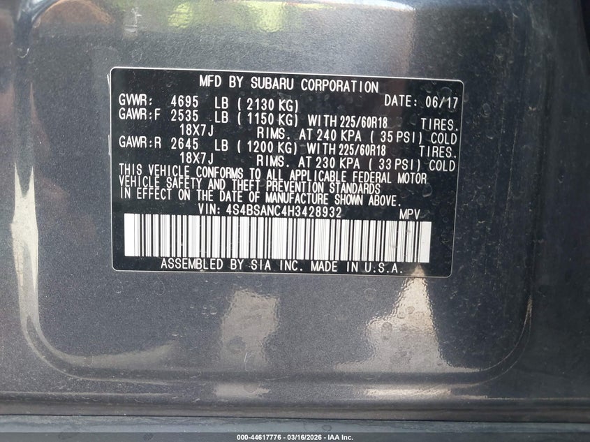 2017 SUBARU OUTBACK 2.5I LIMITED for Sale in Florence, TX
