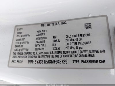2021 TESLA MODEL 3 STANDARD RANGE PLUS REAR-WHEEL DRIVE for Sale in Electric Vehicle Auctions, None