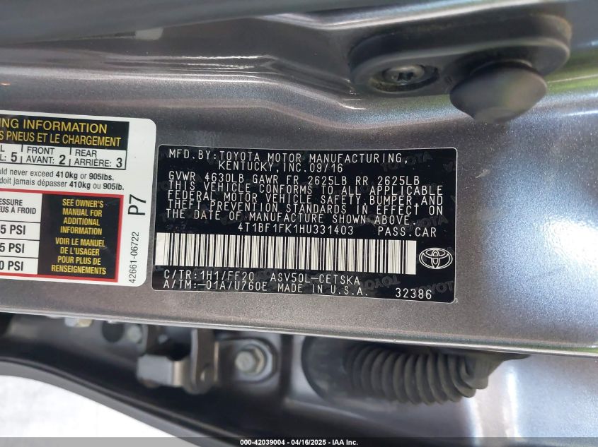 • 4T1BF1FK1HU331403